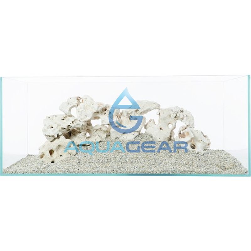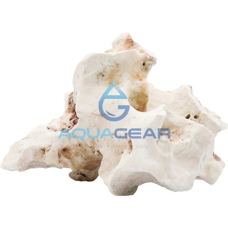 Das Gestein fällt durch seine hellen, warmen Naturtöne auf. Farbnuancen von Cremeweiß über Beige bis hin zu sanften Gelb- und Orangetönen sind typisch und lassen sich harmonisch in die meisten Unterwasser- und Landschaftsgestaltungen einfügen. Die Oberfläche ist rau, kantig und von unregelmäßigen Löchern durchzogen, was eine naturnahe, fast urtümliche Wirkung erzeugt. Da es sich um Kalkstein handelt, bringt das Material zudem eine geologische Besonderheit mit sich: Es kann die Wasserhärte erhöhen und den pH-Wert in den leicht basischen Bereich verschieben.