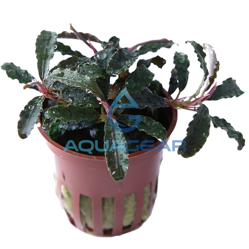 Sie zeichnet sich durch lange, schmale, dunkelgrüne Blätter mit weißen Punkten aus. Die Blätter können 1-2 cm breit und bis zu 6 cm lang werden. Der Wurzelstiel ist rot und ähnelt den roten Bucephalandra-Varianten. Ein blau-metallischer Farbton kann auf den Blättern erscheinen, wenn sie unter Wasser wachsen.