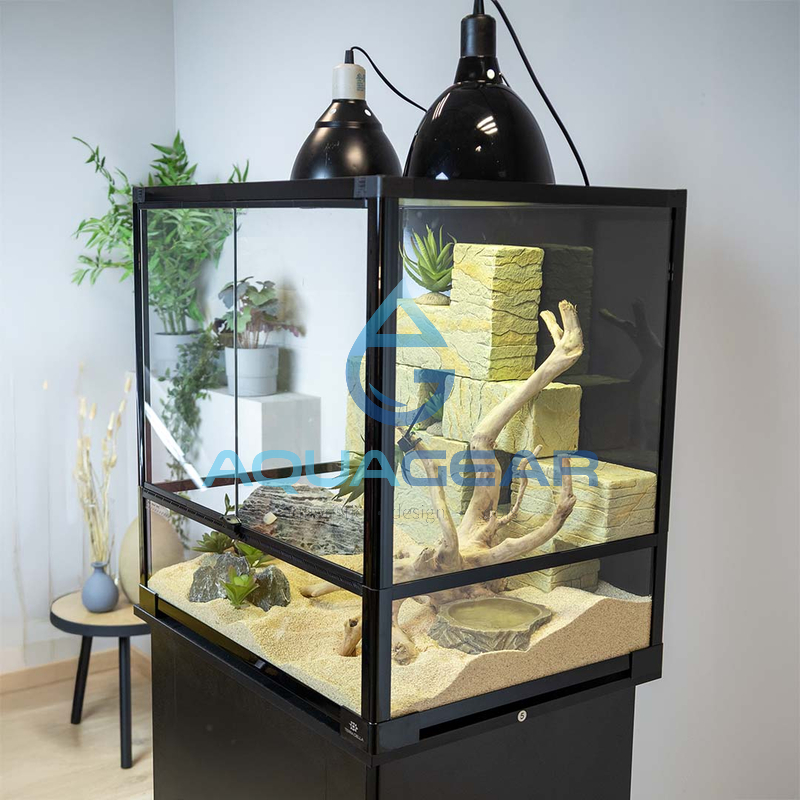 Ein Zwischensegment mit 60 × 45 × 60 cm oder 90 × 45 × 60 cm bietet eine ausgewogenere Relation von Bodenfläche zu Höhe. Solche Terrarien eignen sich besonders für mittelgroße Arten, die gelegentlich klettern und sowohl horizontalen als auch vertikalen Raum nutzen. Dazu zählen kleinere Hagedisarten, Kornnattern-Nachzuchten, wechselwarme Amphibien-Paare oder kleinererSchlangen. Der zusätzliche Höhenraum begünstigt in diesem Segment eine differenzierte Gestaltung mit Verstecken, Ästen oder Kletterstrukturen, was das Verhalten dieser Tiere besser widerspiegelt.