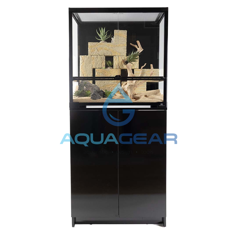 Die Front des Terrariums ist mit Schiebetüren ausgestattet, die aus Glas bestehen und in Führungsschienen laufen. Diese Bauweise erlaubt einen komfortablen Zugang zum Innenraum, ohne dass Türen nach außen schwenken und zusätzlichen Platz beanspruchen. Ein integrierter Verschlussmechanismus sorgt dafür, dass die Türen sicher geschlossen bleiben, was insbesondere bei flinken oder kletterfreudigen Arten relevant ist. Gleichzeitig ermöglicht die Schiebetür-Konstruktion ein schrittweises Öffnen, wodurch Tiere weniger gestresst werden und Eingriffe kontrollierter erfolgen können. Außerdem ist es leicht möglich die Türen herauszunehmen, sollte dies zur Reinigung des Terrariums notwendig sein.
