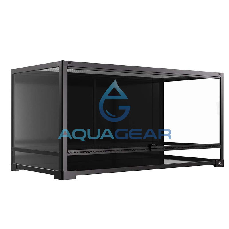 Die Profile, in welche die Glasscheiben eingesetzt werden, bestehen aus robustem Kunststoff oder Verbundmaterial und sind in dunkler Farbgebung gehalten. Diese Rahmen erfüllen mehrere Funktionen gleichzeitig. Einerseits stabilisieren sie die Konstruktion und nehmen die mechanischen Kräfte auf, die durch Gewicht, Substrat, Einrichtung und Technik entstehen. Andererseits schützen sie die Glaskanten vor Beschädigungen und reduzieren das Risiko von Spannungsrissen. Optisch treten die Profile bewusst in den Hintergrund und rahmen den Innenraum klar ein, was dem Terrarium ein sachliches, funktionales Erscheinungsbild verleiht.